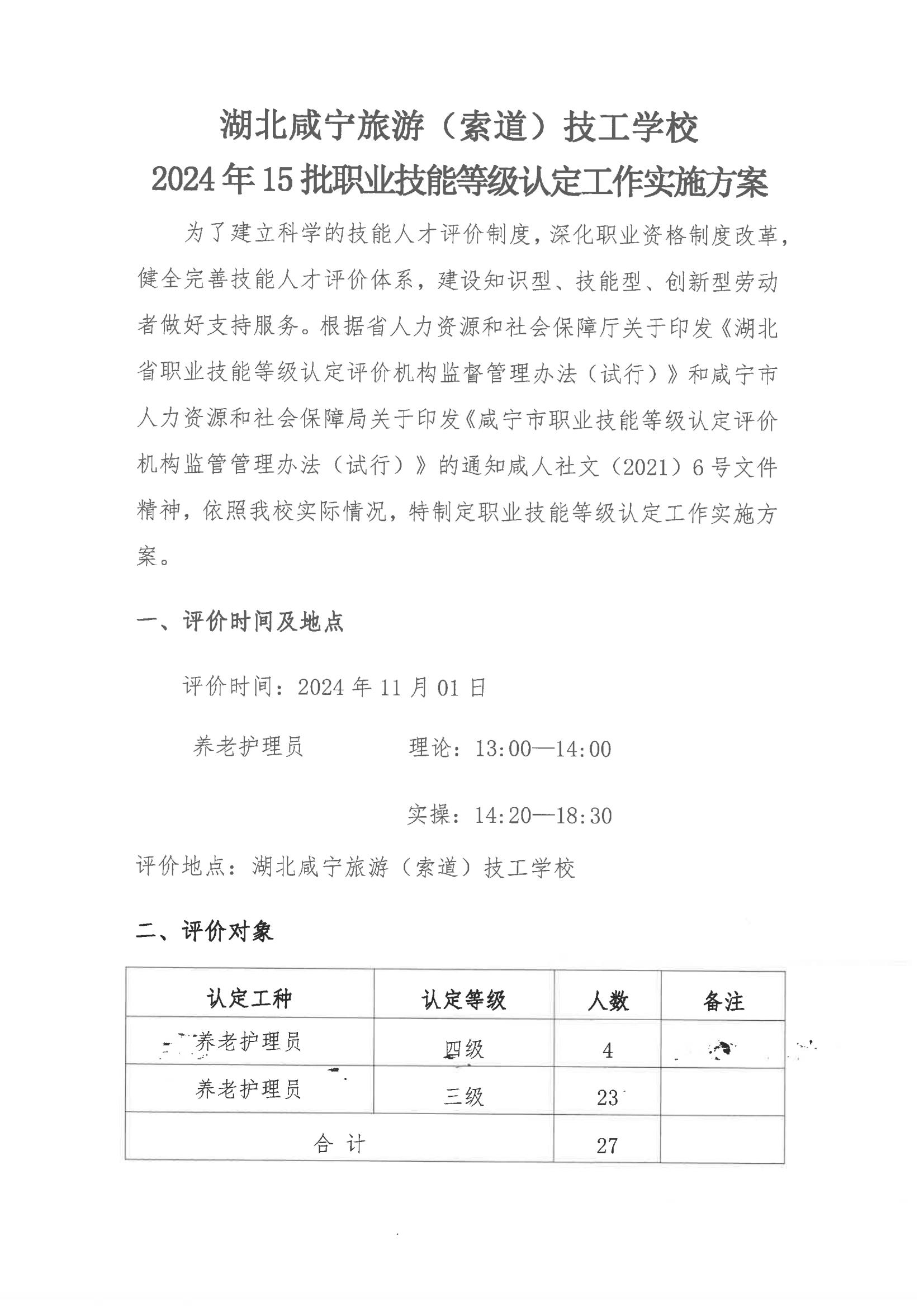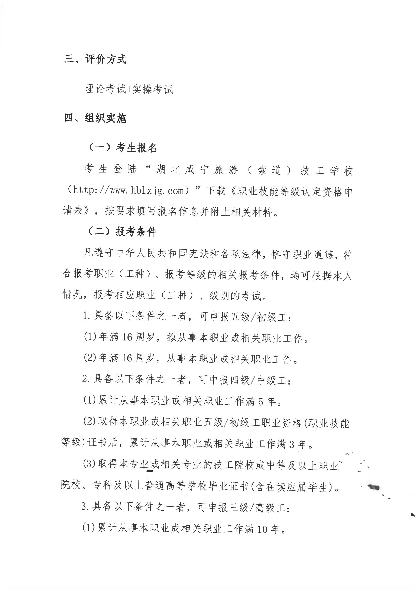 湖北咸宁旅游(索道)技工学校2024年15 批职业技能等级认定工作实施方案
