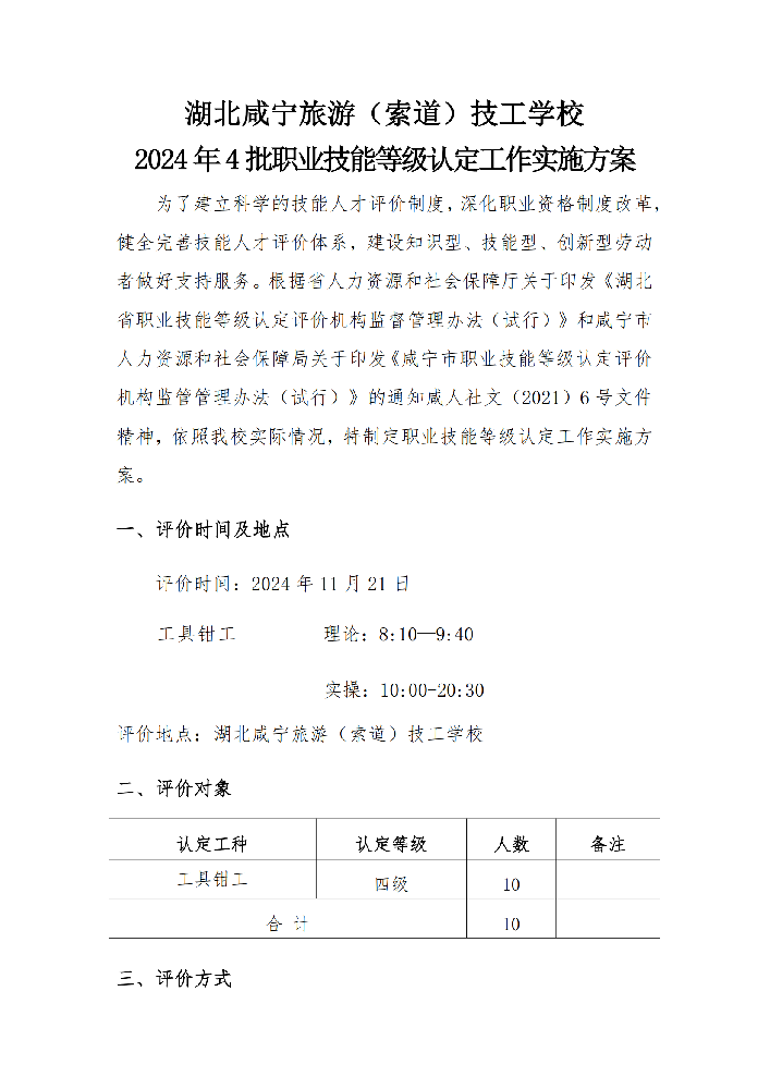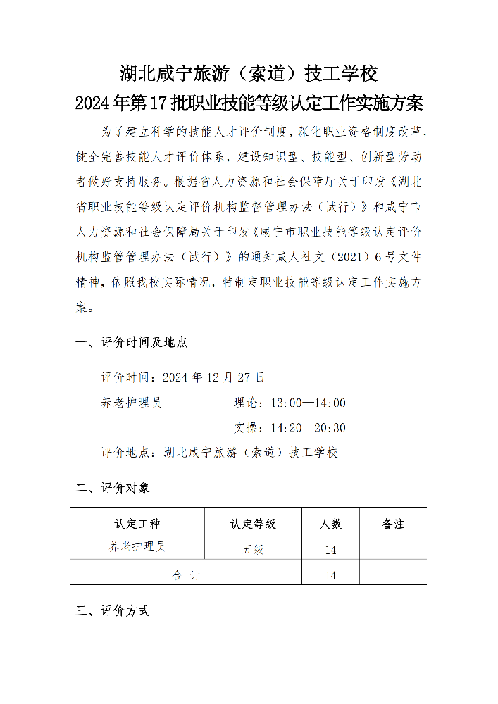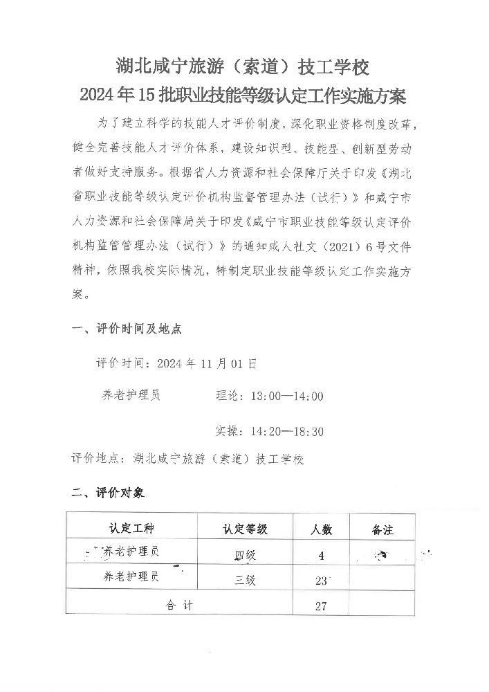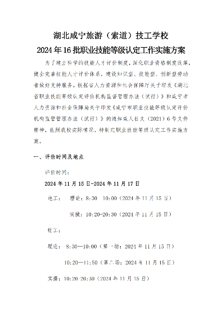 湖北咸宁旅游(索道)技工学校2024年15 批职业技能等级认定工作实施方案