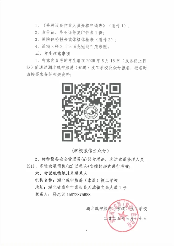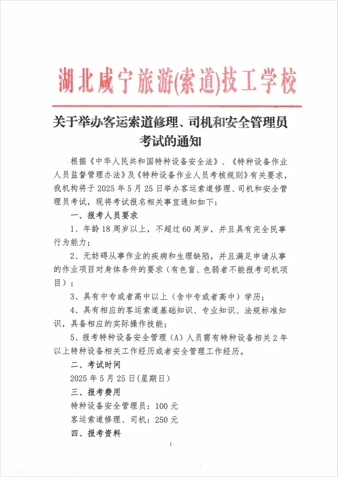 根据《中华人民共和国特种设备安全法》、《特种设备作业人员监督管理办法》及《特种设备作业人员考核规则》有关要求,我机构将于2025年5月25日举办客运索道修理、司机和安全管理员考试,现将考试报名相关事宜通知如下: