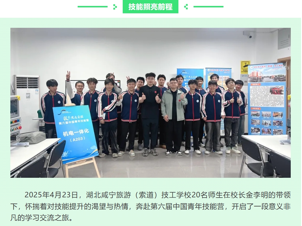 2025年4月23日,湖北咸宁旅游(索道)技工学校20名师生在校长金李明的带领下,怀揣着对技能提升的渴望与热情,奔赴第六届中国青年技能营,开启了一段意义非凡的学习交流之旅。此次活动以“以赛促教、以赛促学、以学促用”为核心目标,通过世界技能大赛选手现场授课、实操演练、互动交流等多元形式,为师生们搭建了与顶尖技能人才对话的桥梁,全方位助力技能提升与职业成长。