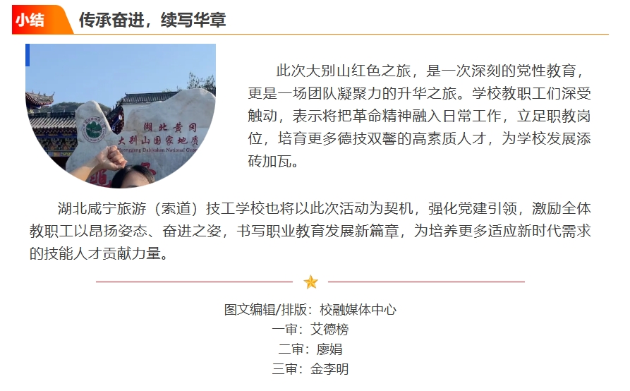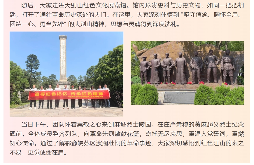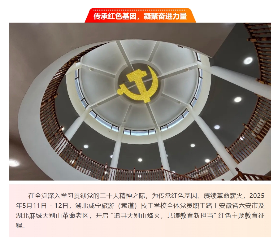 在全党深入学习贯彻党的二十大精神之际,为传承红色基因、赓续革命薪火,2025年5月11日 - 12日,湖北咸宁旅游(索道)技工学校全体党员职工踏上安徽省六安市及湖北麻城大别山革命老区,开启 “追寻大别山烽火,共铸教育新担当” 红色主题教育征程。