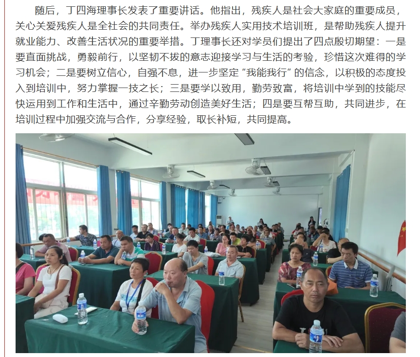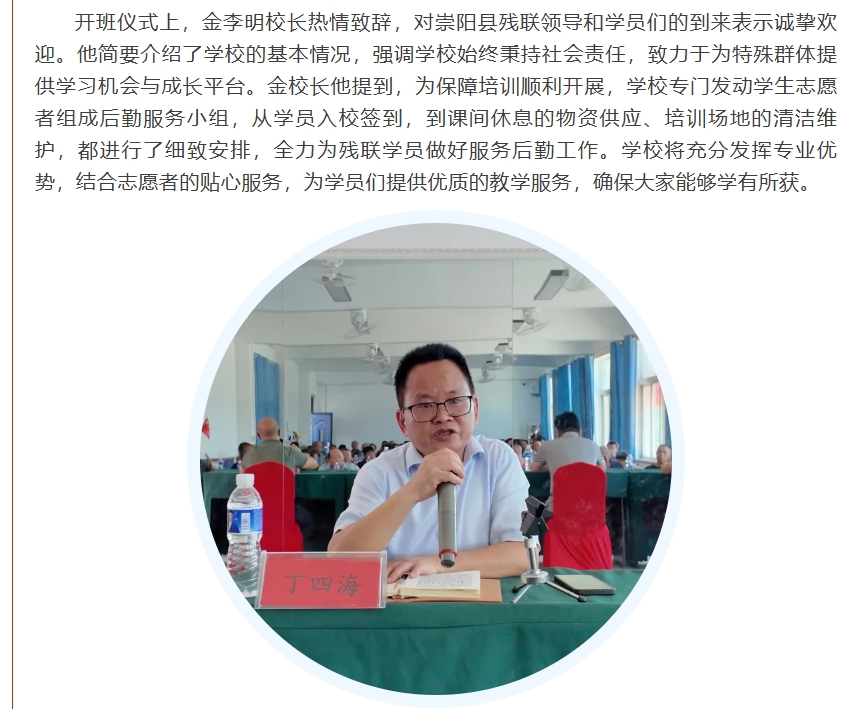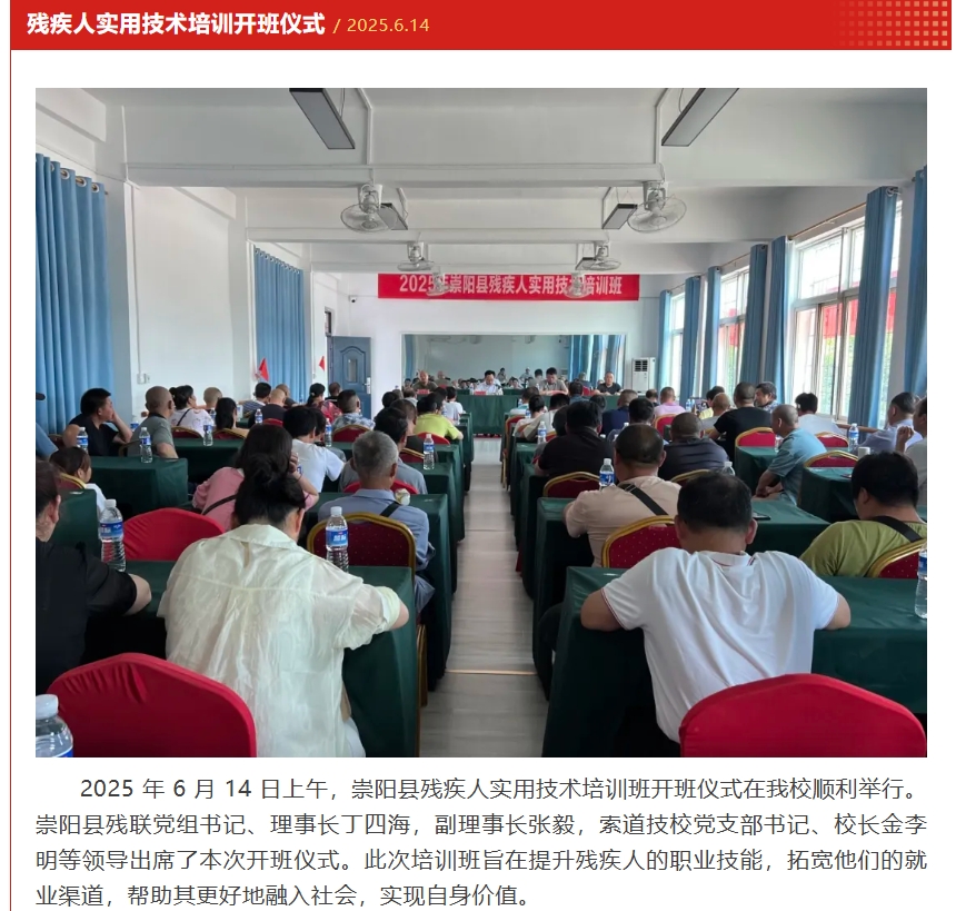 2025 年 6 月 14 日上午,崇阳县残疾人实用技术培训班开班仪式在我校顺利举行。崇阳县残联党组书记、理事长丁四海,副理事长张毅,索道技校党支部书记、校长金李明等领导出席了本次开班仪式。此次培训班旨在提升残疾人的职业技能,拓宽他们的就业渠道,帮助其更好地融入社会,实现自身价值。