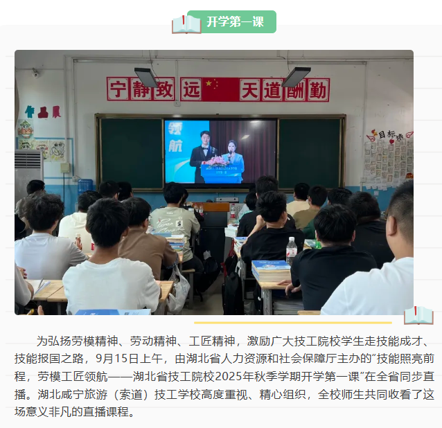 为弘扬劳模精神、劳动精神、工匠精神,激励广大技工院校学生走技能成才技能报国之路,9月15日上午,由湖北省人力资源和社会保障厅主办的“技能照亮前程,劳模工匠领航--湖北省技工院校2025年秋季学期开学第一课”在全省同步直播。湖北咸宁旅游(索道)技工学校高度重视、精心组织,全校师生共同收看了这场意义非凡的直播课程。