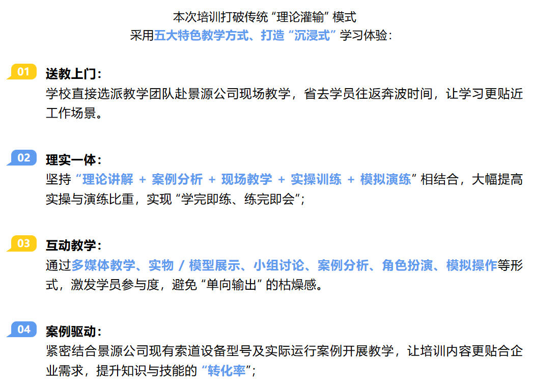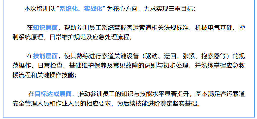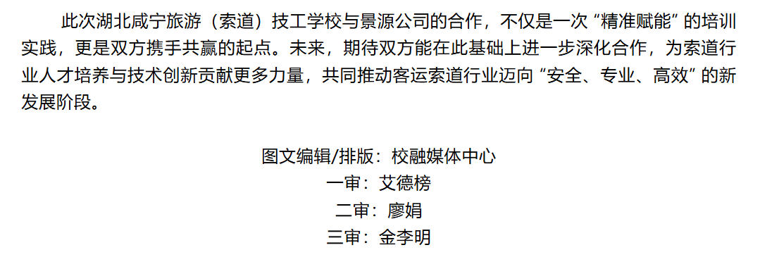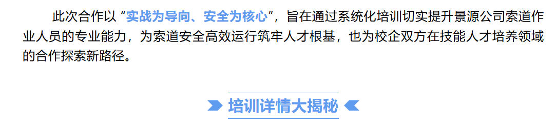 此次合作以 “实战为导向、安全为核心”,旨在通过系统化培训切实提升景源公司索道作业人员的专业能力,为索道安全高效运行筑牢人才根基,也为校企双方在技能人才培养领域的合作探索新路径。