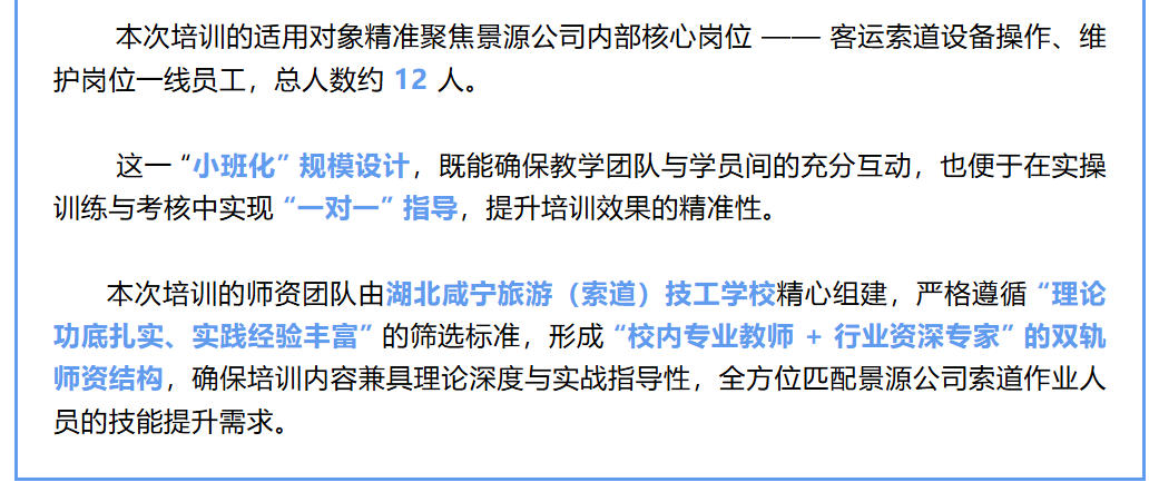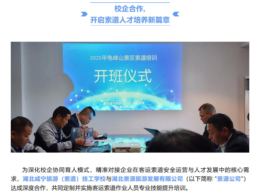 为深化校企协同育人模式,精准对接企业在客运索道安全运营与人才发展中的核心需求,湖北咸宁旅游(索道)技工学校湖北景源旅游发展有限公司(以下简称 “景源公司”)达成深度合作,共同定制并实施客运索道作业人员专业技能提升培训。